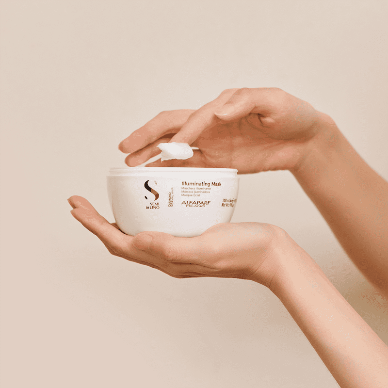 Após lavar os cabelos com o Shampoo Alfaparf Semi Di Lino Diamond, aplique a máscara no comprimento e pontas dos fios úmidos.