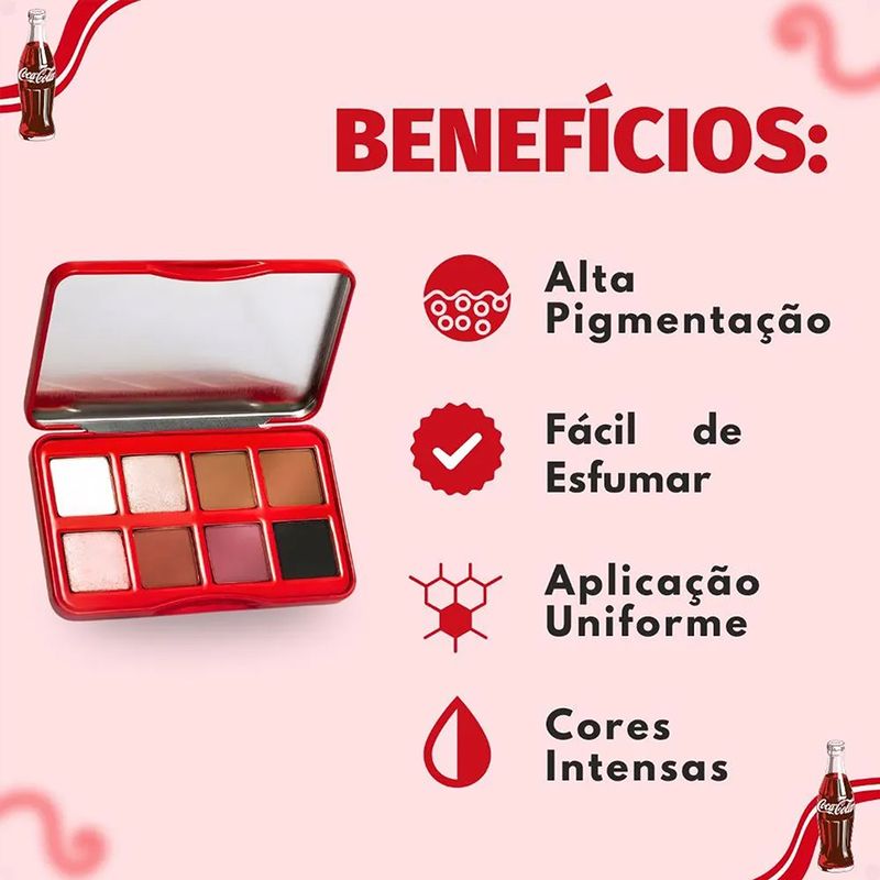 Design ou Praticidade: Paleta compacta com espelho integrado, embalagem colecionável inspirada em Coca-Cola, prática para bolsa ou viagens sem desperdício.