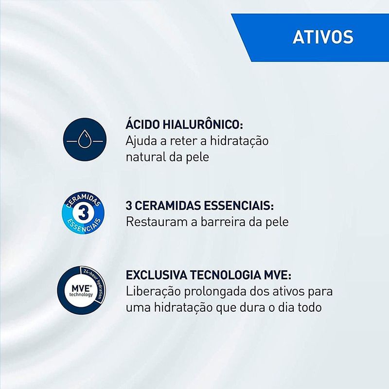 Ingredientes Principais: 3 ceramidas essenciais (NP, AP, EOP), ácido hialurônico, glicerina, tecnologia MVE.