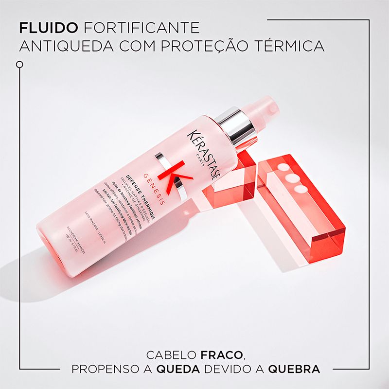 Kérastase Genesis Défense Thermique é um protetor térmico fortificante desenvolvido para cabelos frágeis e com tendência à queda. Sua fórmula enriquecida com células estaminais de edelweiss e raiz de gengibre protege os fios contra os danos causados pelo calor de ferramentas térmicas, como secadores e chapinhas, ao mesmo tempo que fortalece e hidrata o cabelo. Leve e de rápida absorção, ele reduz o frizz, adiciona brilho e suavidade, preservando a resistência natural dos fios e prevenindo a quebra durante a modelagem.