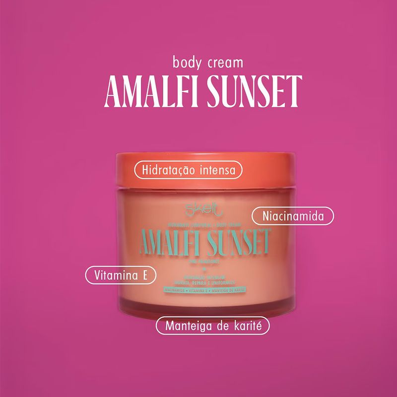 Escolha o Kit Skelt Duo Amalfi Sunset para ter pele bronzeada, hidratada e com cheiro de pôr do sol italiano todos os dias, o duo perfeito que une glow imediato, hidratação luxuosa e perfume viciante, transformando qualquer mulher em deusa do verão eterno.