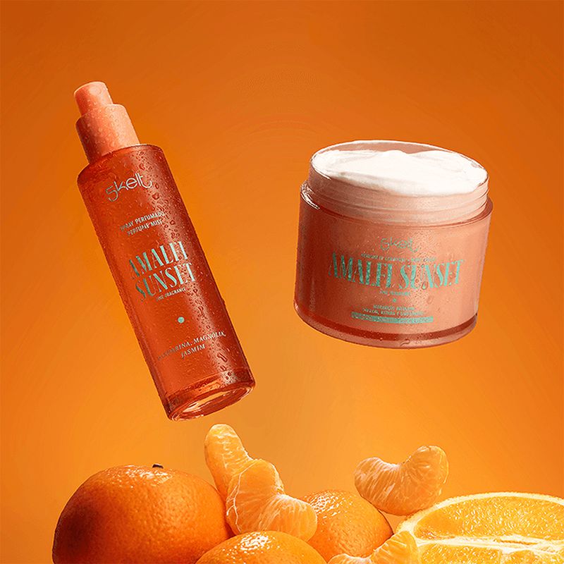 O Kit Skelt Duo Amalfi Sunset é o segredo das brasileiras bronzeadas e perfumadas que querem prolongar o verão o ano todo. Une o Perfume Mist 100ml com explosão fresca de laranja sanguínea, neroli e almíscar dourado ao Hidratante Corporal Laranja 200g com efeito glow imediato, criando camadas viciantes de pôr do sol na Costa Amalfitana que deixam a pele hidratada, iluminada e com cheiro de férias eternas, uma conexão emocional de liberdade, bronze e felicidade radiante que transforma cada dia em praia.