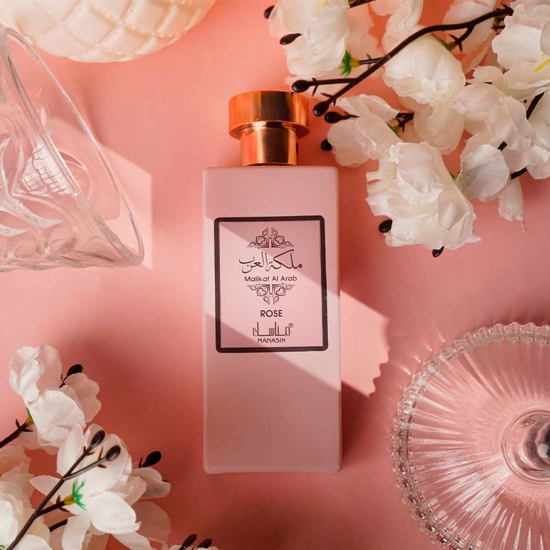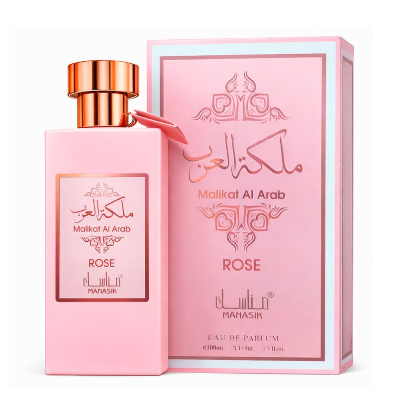Manasik Malikat Al Arab Rose Eau de Parfum é ideal para mulheres que desejam um perfume feminino floral frutado delicado e marcante. Sua assinatura olfativa destaca a elegância da rosa combinada com frutas doces e um fundo quente, criando uma fragrância feminina sofisticada e envolvente.
