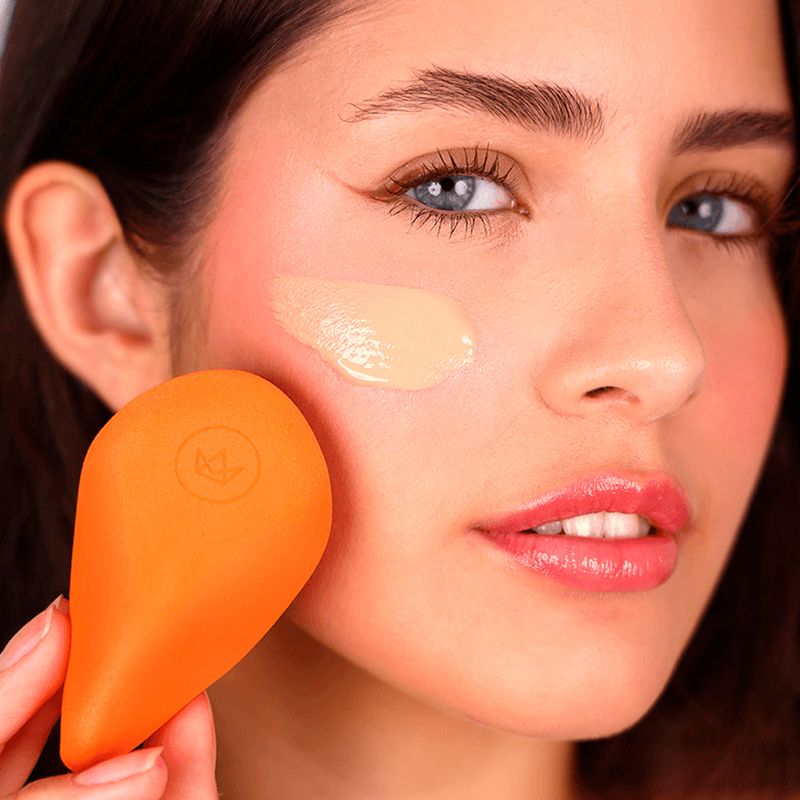 Umedeça a esponja para um acabamento mais natural ou utilize seca para maior cobertura. Aplique o produto no rosto e espalhe com leves batidinhas até obter o efeito desejado. Utilize a ponta para áreas menores e a base para regiões maiores.