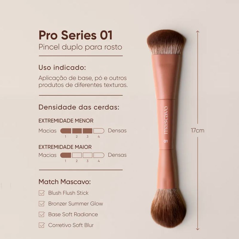Mascavo Pro Series 01 - Pincel de Maquiagem Duplo para Rosto 1un é uma escolha interessante para quem procura um pincel versátil, funcional e confortável de usar. Sua proposta multifuncional facilita a aplicação de diferentes texturas em etapas variadas da maquiagem, enquanto as cerdas sintéticas ultramacias ajudam a entregar um acabamento mais uniforme e agradável na pele. É um acessório pensado para trazer praticidade à rotina, sem abrir mão de desempenho e acabamento.