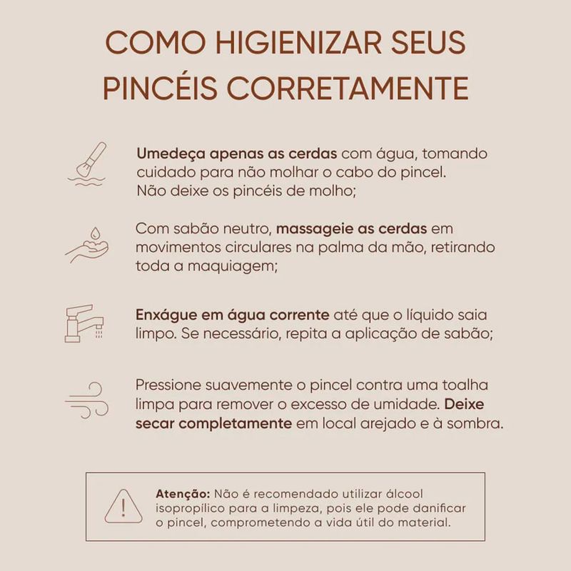 Durabilidade: A higienização regular com água e sabão neutro contribui para preservar o bom desempenho do pincel no uso contínuo.