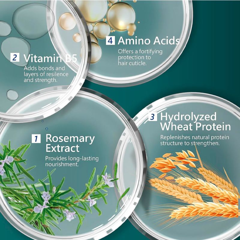 Ativos em destaque: Extrato de alecrim, proteína de trigo hidrolisada, pantenol, colágeno hidrolisado e vitaminas B3, B5, B6, C e E.
