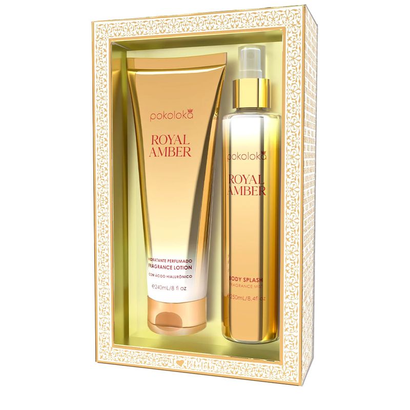 O Pokoloka Kit Loção Body Splash Royal Amber 250ml + Body Lotion 240ml combina hidratação intensa e perfumação oriental baunilha, ideal para momentos especiais, encontros românticos e eventos sofisticados, com embalagens recicláveis e práticas, perfeitas para primavera, verão e clima quente.