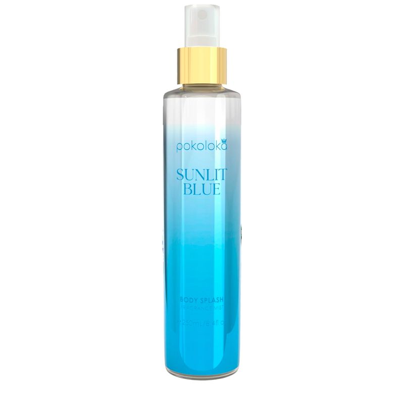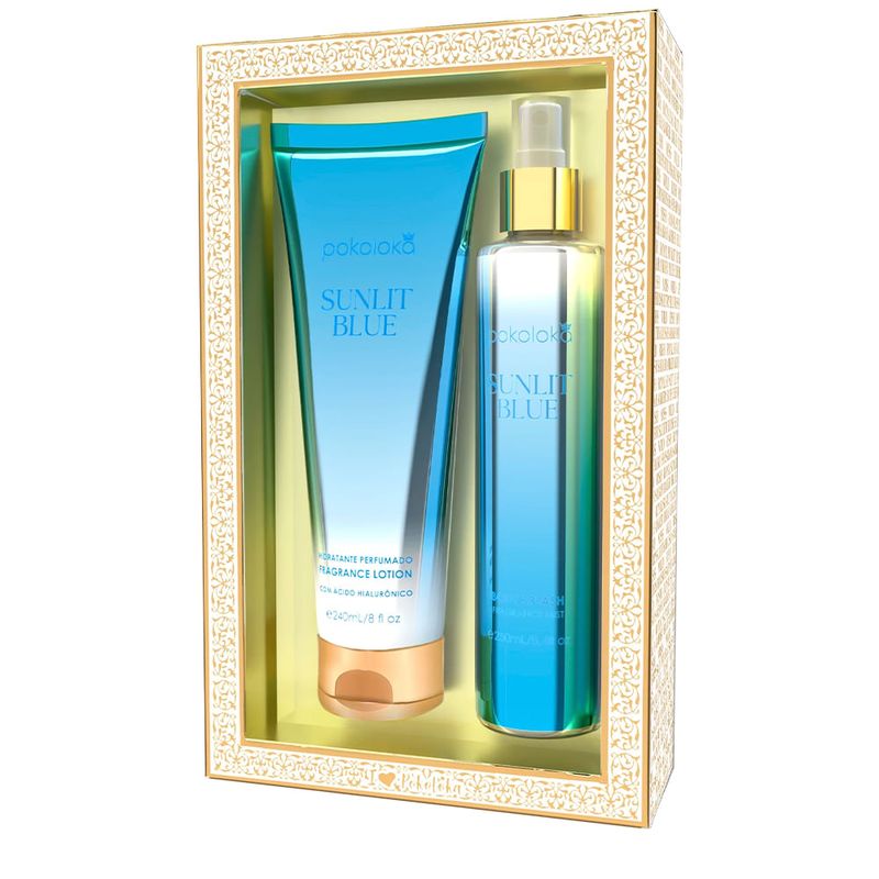 O Pokoloka Kit Loção Body Splash Sunlit Blue 250ml + Body Lotion 240ml combina hidratação intensa e perfumação floral frutado, ideal para momentos especiais, encontros românticos e eventos sofisticados, com embalagens recicláveis e práticas, perfeitas para primavera, verão e clima quente.