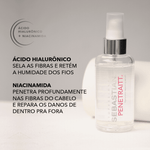 Ativos Principais: Ácido hialurônico hidrata e plumpa os fios instantaneamente; niacinamida fortalece a fibra capilar e reduz a quebra; óleos reparadores nutrem e protegem contra danos futuros, promovendo elasticidade e brilho