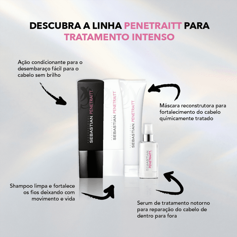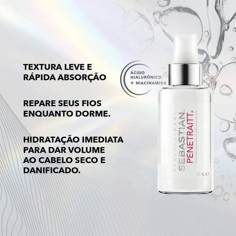 O Sebastian Penetraitt é um sérum reparador noturno premium da renomada marca Sebastian Professional, projetado para regenerar cabelos secos e danificados por ferramentas térmicas, colorações ou fatores ambientais. Parte da linha Penetraitt, dedicada à reparação profunda e fortalecimento da fibra capilar, este tratamento leave-in utiliza uma fórmula inovadora com ácido hialurônico e niacinamida para penetrar intensamente nos fios durante o sono, restaurando suavidade, brilho e vitalidade. Inspirado na expertise de salões profissionais em soluções transformadoras, é ideal para quem experimenta com estilos ousados e busca resultados visíveis sem esforço diário. A embalagem elegante, com frasco de plástico reciclável e pump ergonômico, garante praticidade e sustentabilidade, refletindo o compromisso da marca com a inovação ética e a sofisticação acessível.