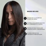 Modo de Aplicação: Aplique 2-5 pumps nas palmas das mãos e distribua uniformemente nos comprimentos e pontas de cabelos secos ou úmidos. Escove para finalizar e deixe agir durante a noite, sem enxaguar. Pela manhã, lave normalmente ou reaplique após o shampoo para uso diário.