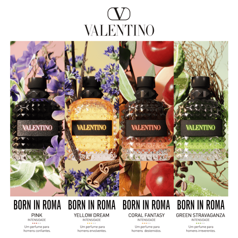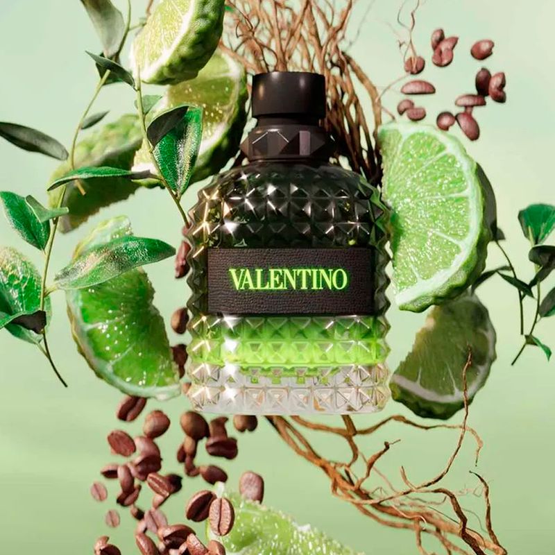 O Valentino Uomo Born In Roma Green Stravaganza Eau de Toilette - Perfume Masculino 100ml e 50ml combina frescor cítrico com notas quentes de café e vetiver, ideal for eventos diurnos e climas quentes. Com fórmula vegana e frasco rockstud em verde, é uma fragrância vibrante e sofisticada para o homem moderno.