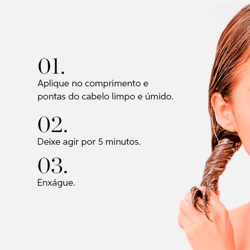 Modo de Aplicação: Após lavar os cabelos com shampoo (idealmente da mesma linha), retire o excesso de água. Aplique a máscara da raiz às pontas, massageie e deixe agir por 5 minutos. Enxágue bem.